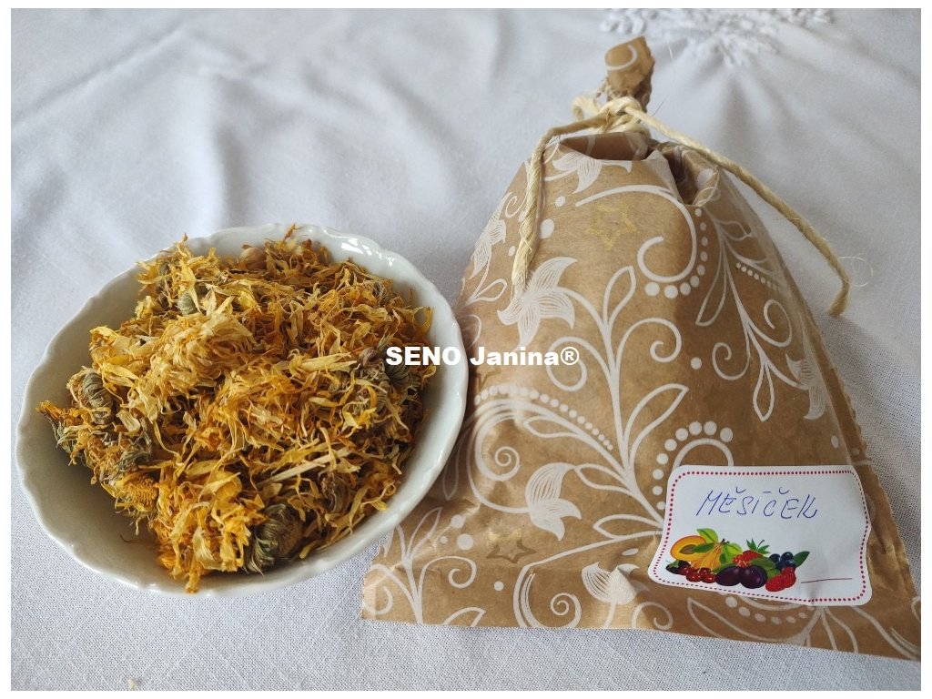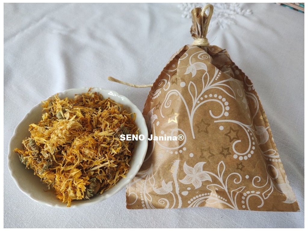 Měsíček sušený celým květem, v ozdobném papírovém sáčku, přičemž barva sáčku se může lišit.