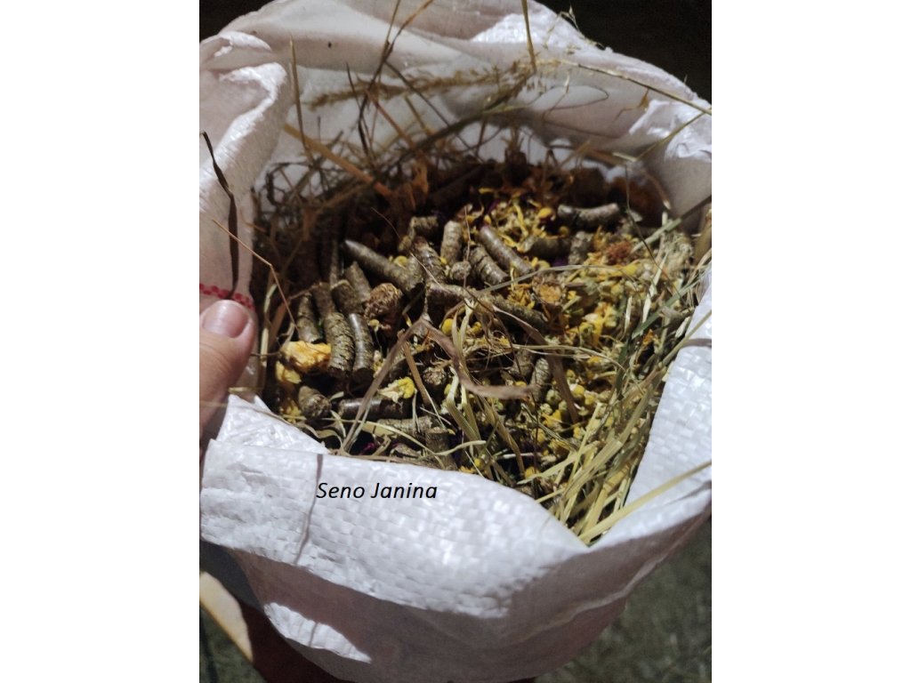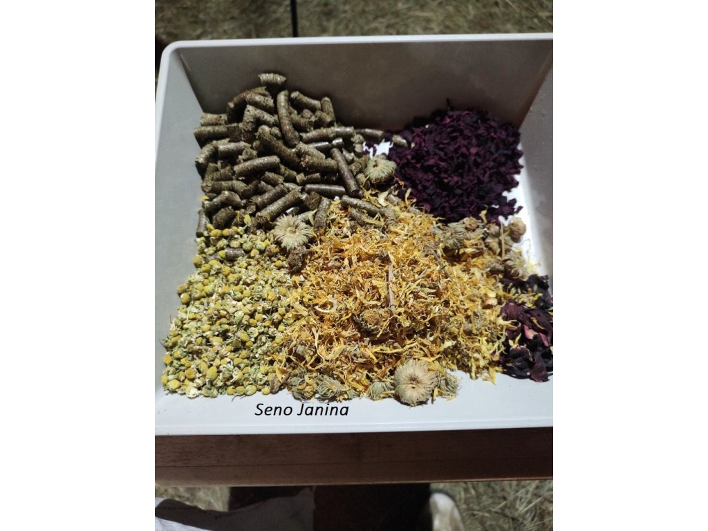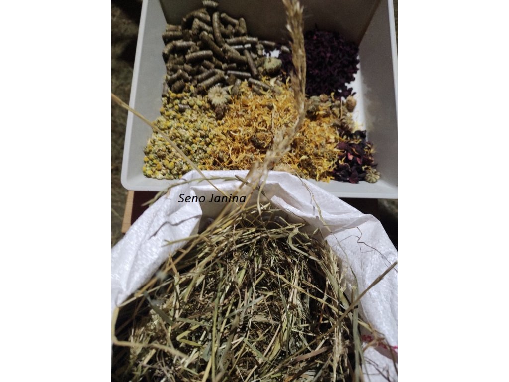 Složení: bylinkové luční seno, krmné peletky Janina ( bylinkové luční seno