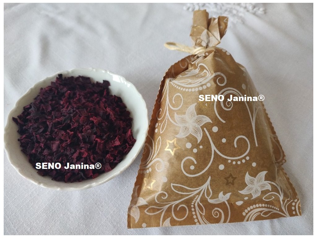 Řepa červená sušená v kostkách, v ozdobném papírovém sáčku, přičemž barva sáčku se může lišit.